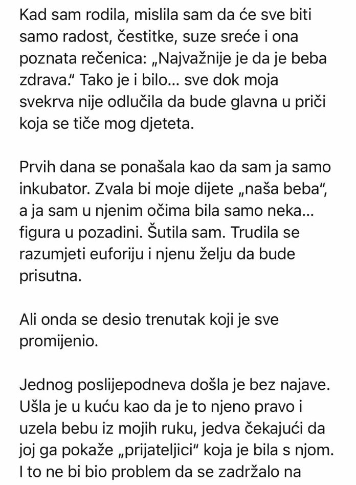 Kad sam rodila, mislila sam da će sve biti samo radost, čestitke, suze sreće i ona poznata rečenica: „Najvažnije je da je beba zdrava.“ Tako je i bilo… sve dok moja svekrva nije odlučila da bude glavna u priči koja se tiče mog djeteta.