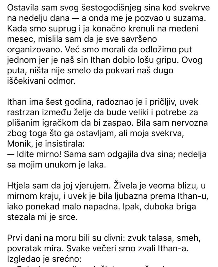 Ethan je imao šest godina, radoznao i pričljiv, uvek negde između želje da bude veliki i potrebe za svojim plišanim medom da zaspi. Bila sam nervozna što ga ostavljam, ali moja svekrva, Monique, insistirala je: