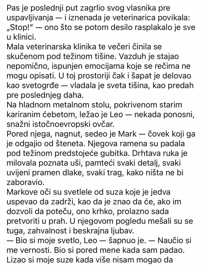 I odjednom se desilo nešto neočekivano. Skupivši poslednju snagu, Leo je podigao šape i zagrlio Marka oko vrata. Njegovi slabi, drhtavi pokreti bili su ispunjeni snagom ljubavi. To je bilo i oproštaj i izraz zahvalnosti: „Hvala ti što si bio uz mene. Hvala ti za dom. Hvala ti što si moj čovek.“
