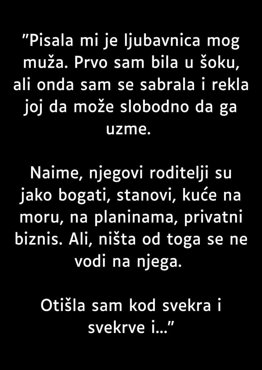 “Pisala mi je ljubavnica mog muža. Prvo sam bila u šoku, ali onda sam se sabrala i rekla joj da može slobodno da ga uzme.