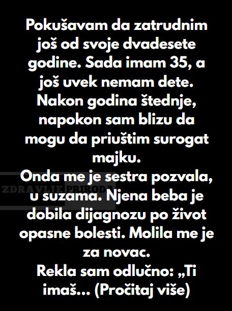 Ako dam taj novac, gubim svoju poslednju šansu da postanem majka. Imam 35 godina. Moj plodni period se brzo završava. Moj san mi klizi iz ruku — i to sve zbog porodice koja misli da treba da žrtvujem ceo svoj život zbog njihove krize.