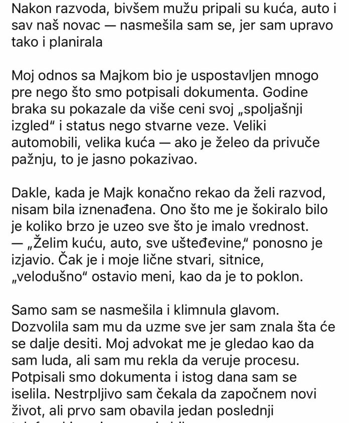 Posle razvoda, muž je dobio sve, a ona se smeškala — jer je upravo tako to i isplanirala.
