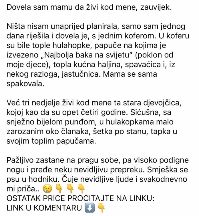 Ništa nisam unaprijed planirala, samo sam jednog dana riješila i dovela je, s jednim koferom. U koferu su bile tople hulahopke, papuče na kojima je izvezeno „Najbolja baka na svijetu“ (poklon od moje djece), topla kućna haljina, spavaćica i, iz nekog razloga, jastučnica. Mama se sama spakovala.