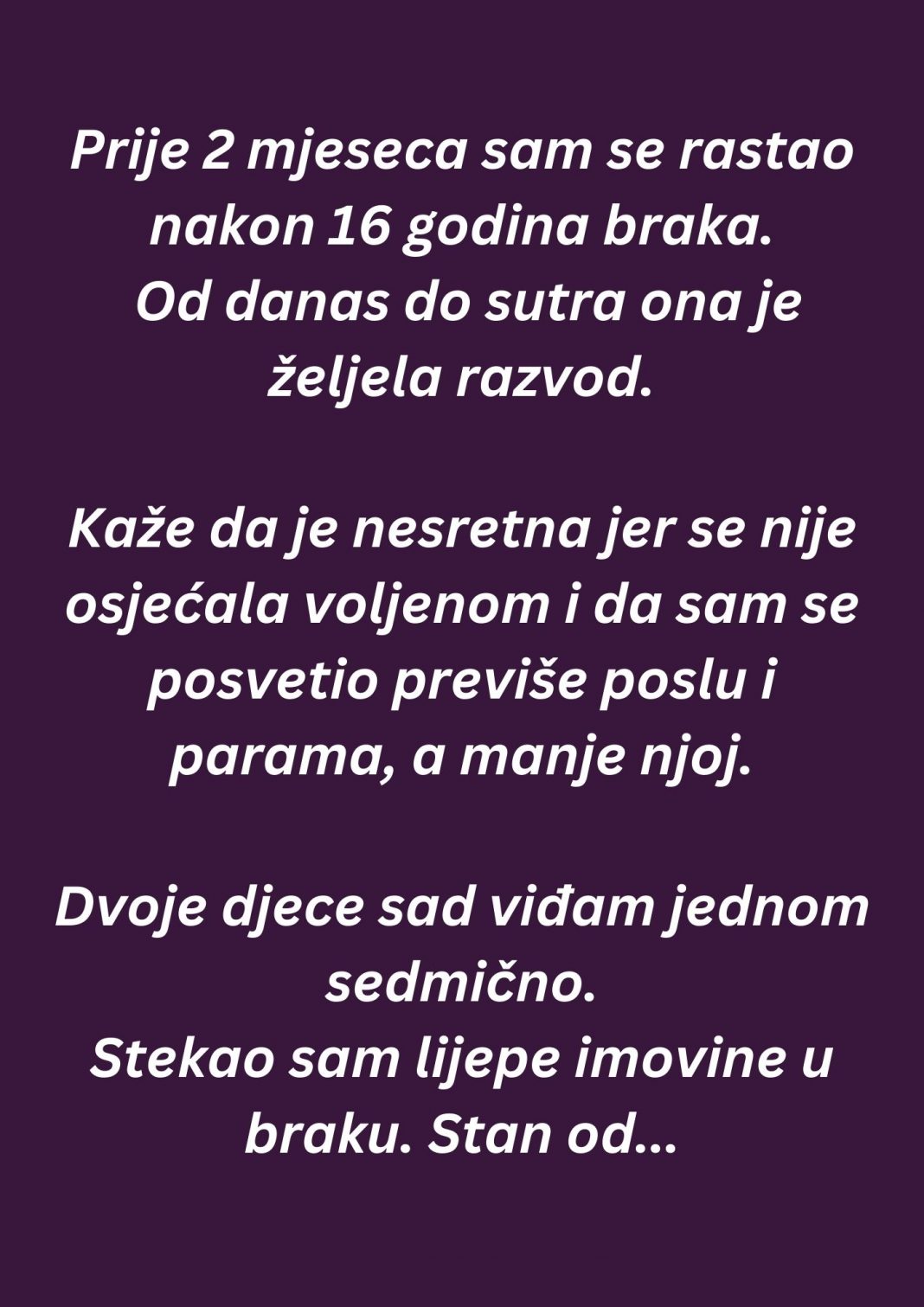 Dvoje djece sad viđam jednom sedmično. Stekao sam lijepe imovine u braku. Stan od… 200 000, kuća, auto od 60 000. Nisam znao da cijenim šta je žena sve dok nisam ostao bez nje.
