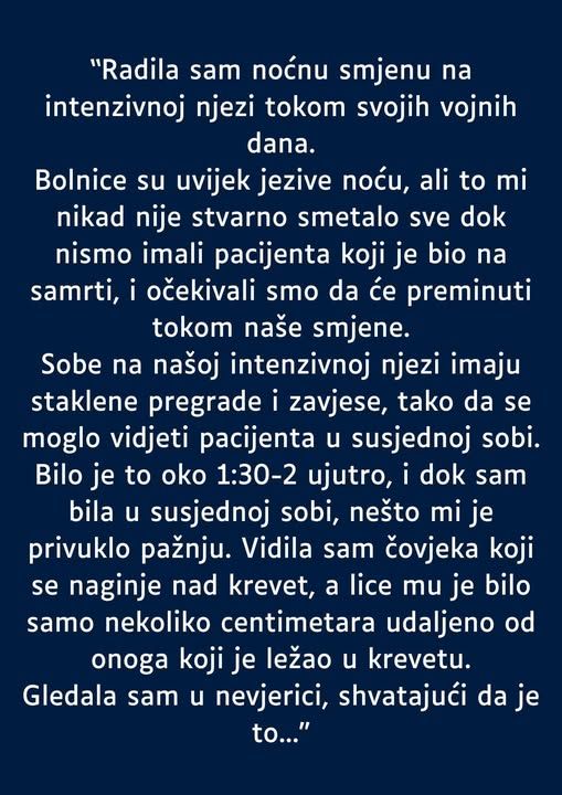 Gledala sam u nevjerici, shvatajući da je to isti čovjek kako gleda sebe u krevetu. Misleći da haluciniram, zaobišla sam pregradu da vidim da li je neki kolega u sobi, ali nikoga nije bilo.