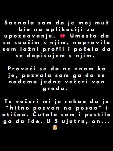 Nastavljajući igru, pozvala sam ga da se nađemo te večeri van grada. Te večeri mi je rekao da je “hitno pozvan na posao” i otišao. Ćutala sam i pustila ga da ide. Vratio se kući u 5 ujutru, besan. Put mu je trajao po dva sata u oba smera, a potrošio je pravo bogatstvo na taksi — samo da bi shvatio da ga tamo niko ne čeka.