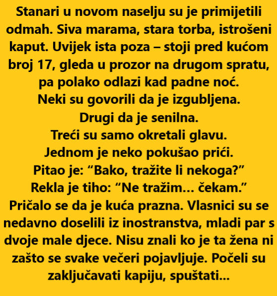 Stanari u novom naselju su je primijetili odmah. Siva marama, stara torba, istrošeni kaput. Uvijek ista poza – stoji pred kućom broj 17, gleda u prozor na drugom spratu, pa polako odlazi kad padne noć.