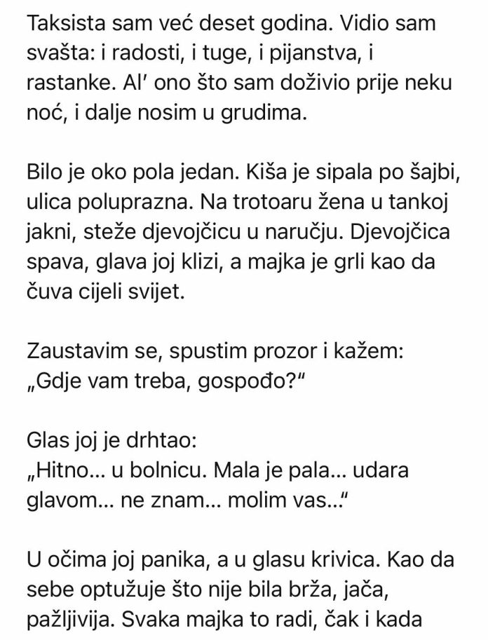 „Taksista sam i prije neku noć, oko pola jedan, vidim ženu koja drži djevojčicu u rukama…“