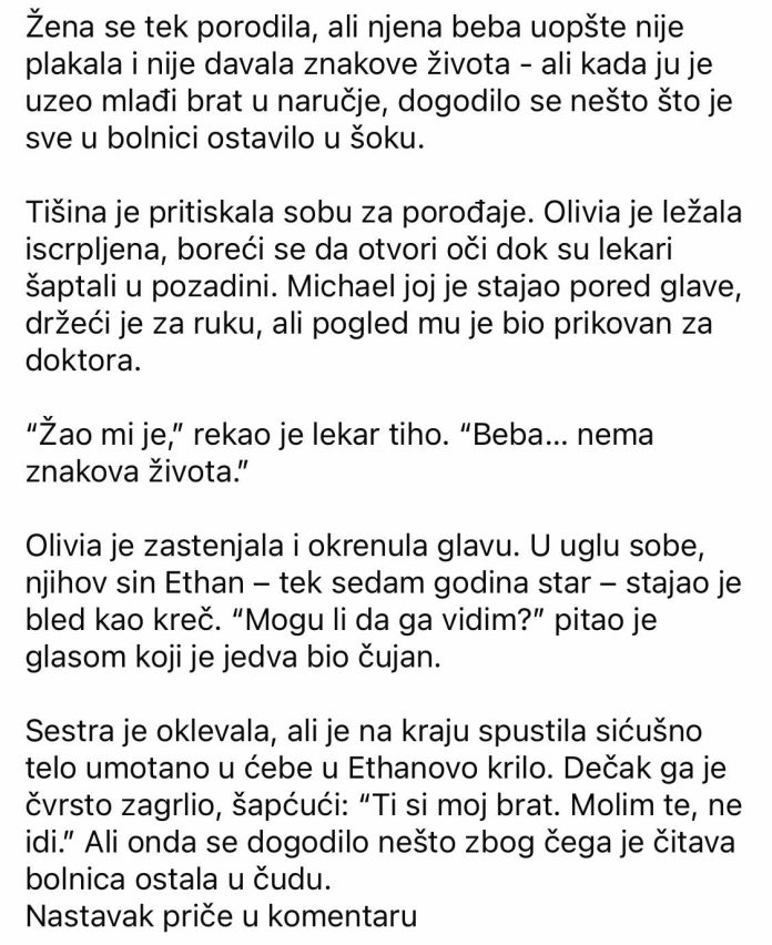 “Žao mi je,” rekao je lekar tiho. “Beba… nema znakova života.”Olivia je zastenjala i okrenula glavu. U uglu sobe, njihov sin Ethan – tek sedam godina star – stajao je bled kao kreč. “Mogu li da ga vidim?” pitao je glasom koji je jedva bio čujan.