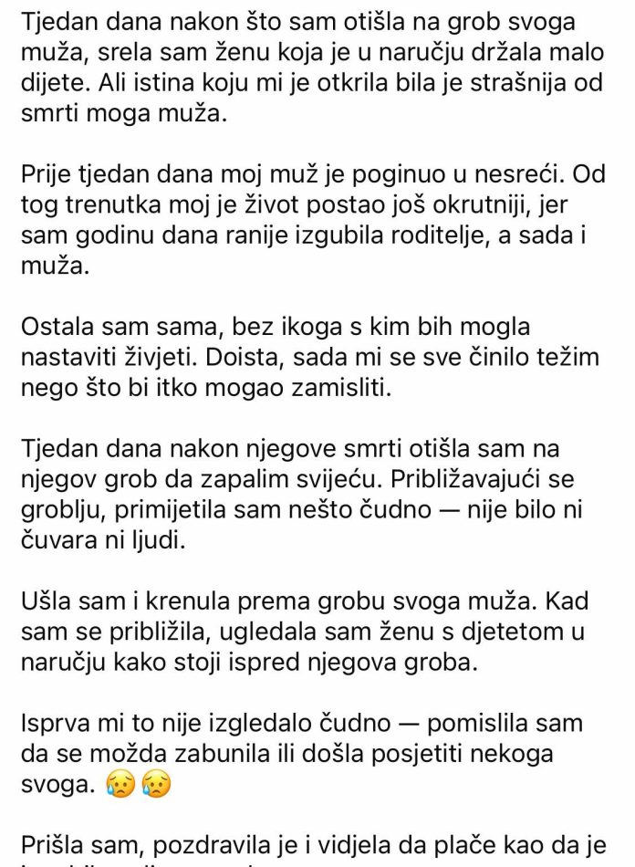 Krenula sam prema grobu svoga muža i kad sam se približila, vidjela sam ženu s djetetom u naručju kako stoji ispred njega.