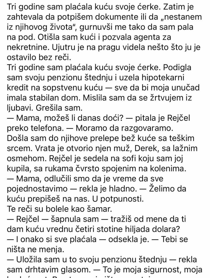 Kada sam stigla ispred njihove kuće, srce mi se steglo. Prelepa krem fasada, bela ograda, negovan travnjak – sve to kupljeno mojim novcem. Rekla sam sebi: možda će mi danas konačno reći „hvala“. Grešila sam.