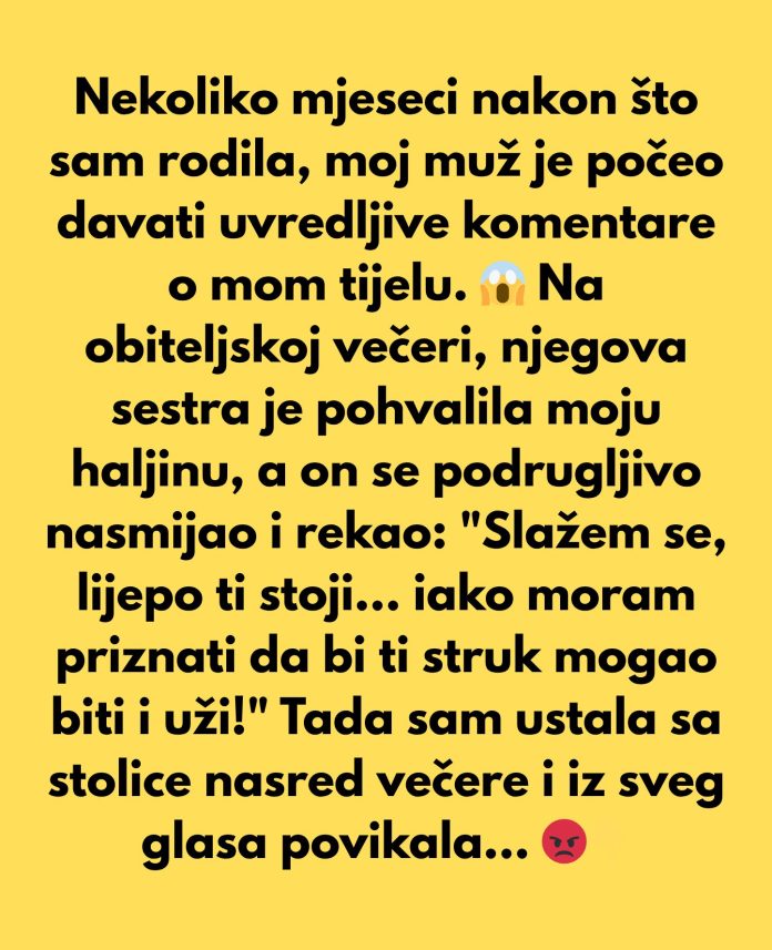 U prostoriji je zavladala neugodna tišina. Žena je bila potpuno bijesna i osjećala je da joj je to bila kap koja je prelila čašu nakon svih muževih uvredljivih primjedbi. Kaže da je u tom trenutku „ustala sa stolice nasred večere i iz sveg glasa povikala: ‘PRESTANI PRIČATI O MOM TIIJELUUUU!!!’“