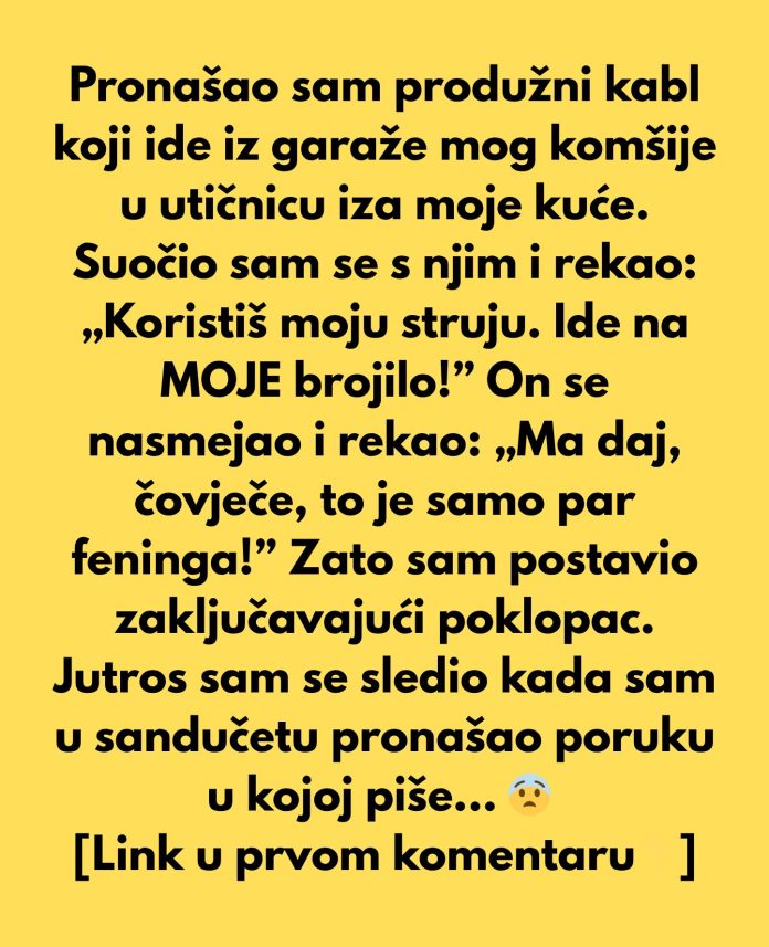 Onda sam ga uhvatio da to ponovo radi. Prišao sam mu mirno i rekao: „Brate, ti koristiš moju struju, to ide na MOJ brojilo!” On se samo nasmejao i rekao: „Ma hajde, čovječe. To je samo par feninga!”