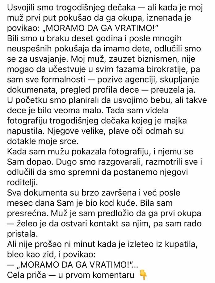 Usvojili smo trogodišnjeg dečaka. Kada je moj muž prvi put pokušao da ga okupa, on je iznenada vrisnuo, kao da je video nešto nemoguće. Tada još nisam shvatala da će taj trenutak zauvek promeniti naše živote.