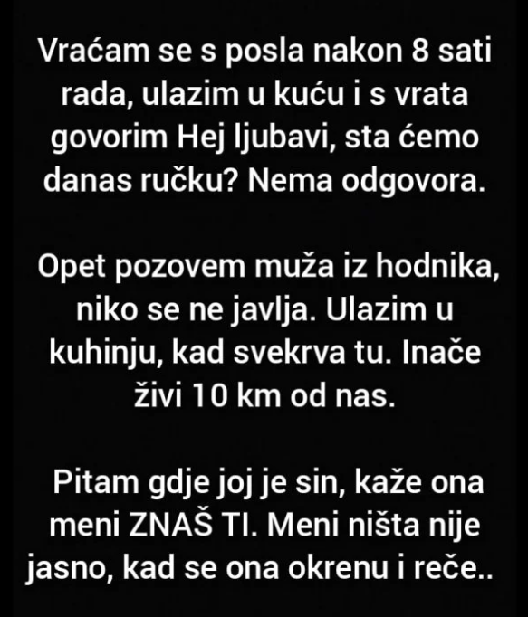 Opet pozovem muža iz hodnika, niko se ne javlja. Ulazim u kuhinju, kad svekrva tu. Inače živi 10 km od nas.