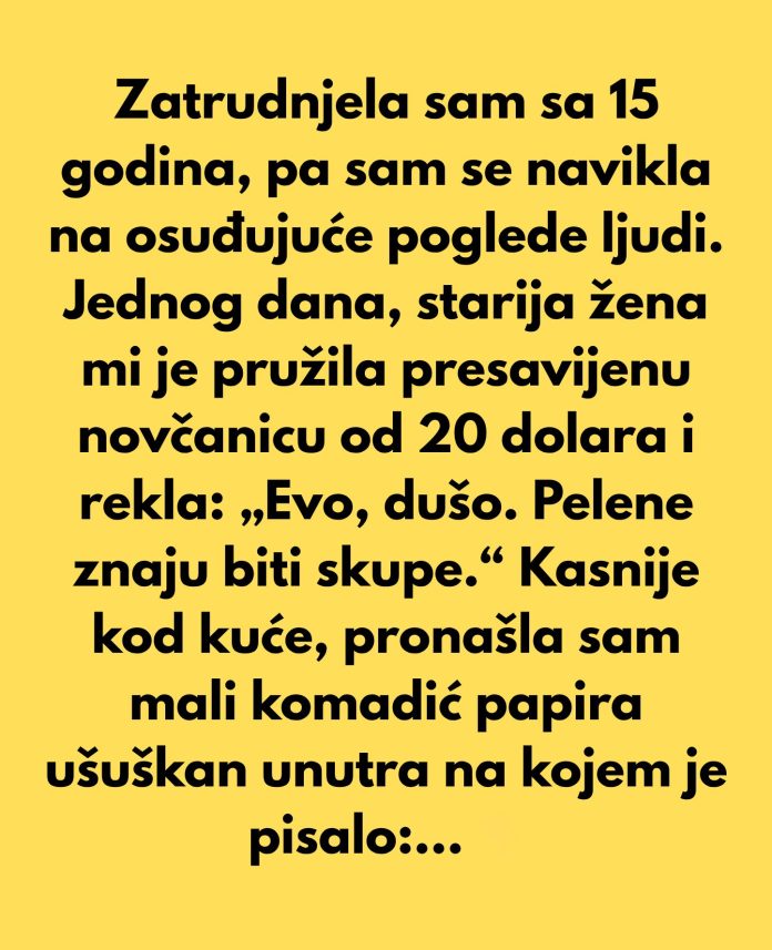 Zatrudnjela sam sa 15 godina, pa sam se navikla na osuđujuće poglede ljudi. Jednog dana, starija žena mi je pružila presavijenu novčanicu od 20 dolara i rekla: „Evo, dušo. Pelene znaju biti skupe.“ Kasnije kod kuće pronašla sam mali komadić papira ušuškan unutra na kojem je pisalo: „Jača si nego što misliš.“ Godinama kasnije otkrila sam jedva vidljiv natpis na poleđini — moje ime.