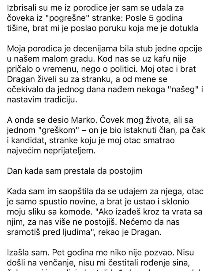 Izbrisali su me iz porodice jer sam se udala za čoveka iz “pogrešne” stranke: Posle 5 godina tišine, brat mi je poslao poruku koja me je dotukla Moja porodica je decenijama bila stub jedne opcije u našem malom gradu. Kod nas se uz kafu nije pričalo o vremenu, nego o politici. Moj otac i brat Dragan živeli su za stranku, a od mene se očekivalo da jednog dana nađem nekoga “našeg” i nastavim tradiciju. A onda se desio Marko. Čovek mog života, ali sa jednom “greškom” – on je bio istaknuti član, pa čak i kandidat, stranke koju je moj otac smatrao najvećim neprijateljem.