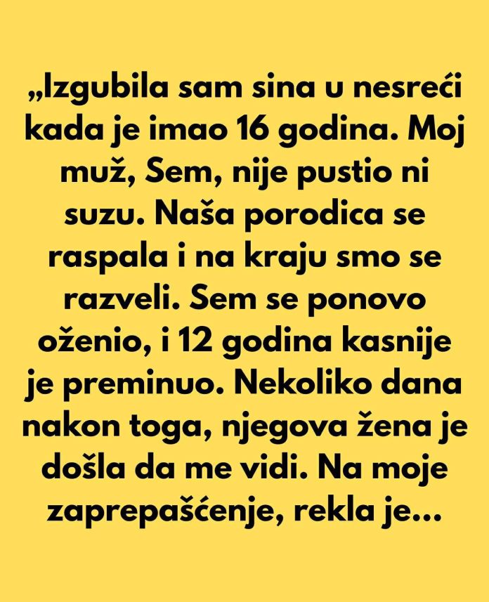 „Izgubila sam sina u nesreći kada je imao 16 godina. Moj muž, Sem, nije pustio ni suzu. Naša porodica se raspala i na kraju smo se razveli. Sem se ponovo oženio, i 12 godina kasnije je preminuo. Nekoliko dana nakon toga, njegova žena je došla da me vidi.