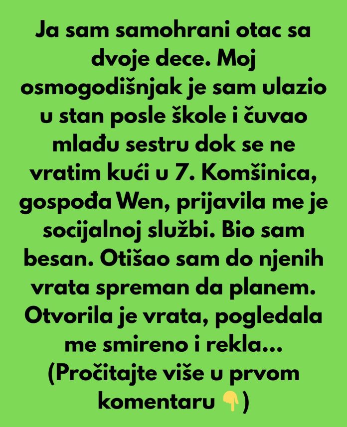 Moja komšinica, gospođa Wen, prijavila me je socijalnoj službi. Ja sam samohrani otac sa dvoje dece, radim duple smene. Moj osmogodišnjak je sam ulazio u stan posle škole i čuvao mlađu sestru dok se ja ne vratim kući u 7. Nije bilo idealno, ali to je sve što sam imao.