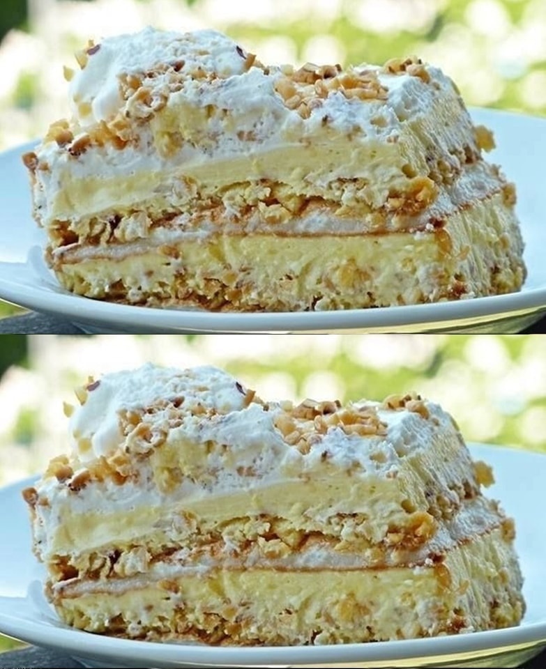 Slasticu slažite tako da stavite beze koru, zatim tamnu kremu, pa žutu kremu. Ponovite ovaj niz s drugom beze korom, tamnom kremom i žutom kremom, a na kraju sve prelijte šlagom i pospite krupno sjeckanim orasima.