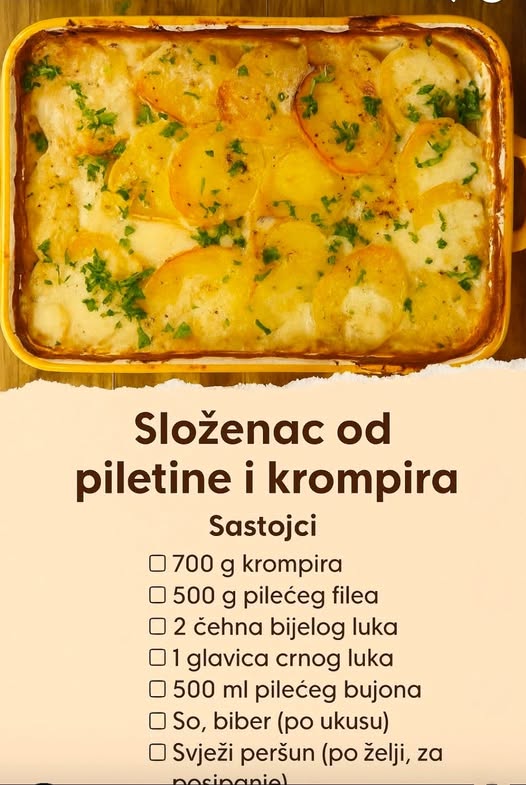 JEDNOSTAVAN SL0ŽENAC 0D PILETINE I KROMPIRA: Poređajte slojeve u tepsiju i zapecite