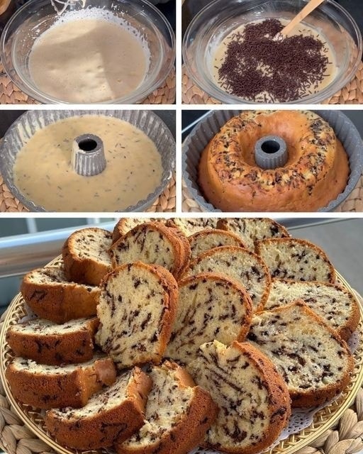 Dodati brašno, ekstrakt vanile i prašak za pecivo i promešati. Na vrh dodajte granuliranu čokoladu i nastavite miksati.