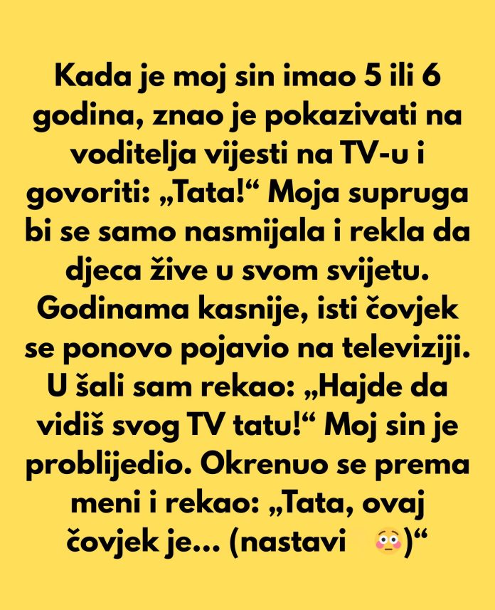 Godinama kasnije, isti taj voditelj ponovo se pojavio na TV ekranu. U šali sam rekao: „Hajde da vidiš svog TV tatu!“ Moj sin je problijedio, ali prije nego što je uspio nešto reći, moja supruga je iznenada počela kašljati i zamolila ga da joj donese čašu vode. Međutim, sin se okrenuo prema meni i rekao: „Vrijeme je da sazna istinu!“ Zatim je dodao: „Tata, ovaj čovjek je — ili je bio — mamin dečko. Kad sam bio mali, ona je išla da se viđa s njim i vodila je i mene.“
