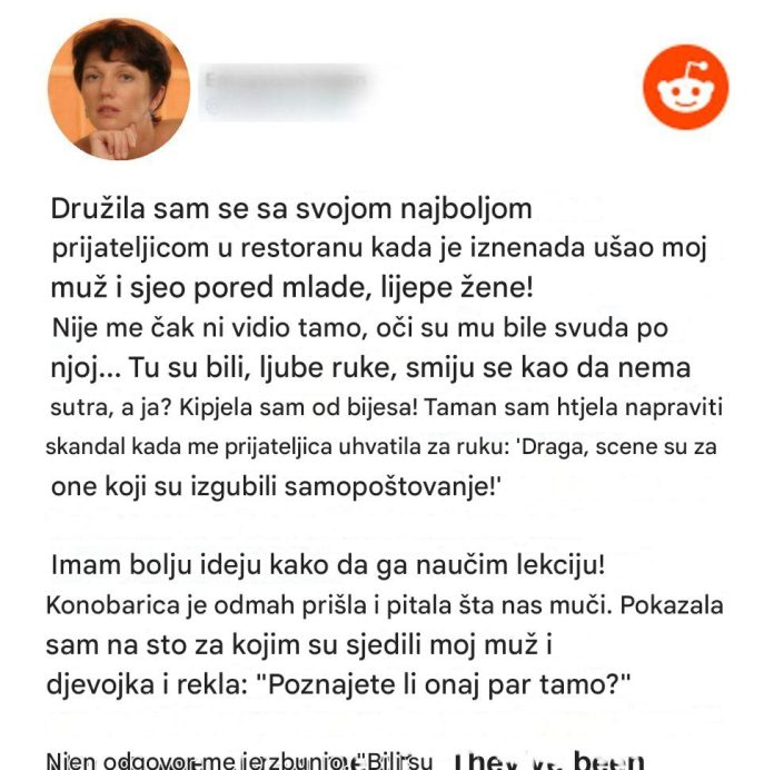 Sandra se nagnula da bolje vidi i ugledala muža kako prolazi između stolova i seda sa prelepom mladom ženom. Srce joj je stalo. „To ne može biti poslovni sastanak“, šapnula je Janet.