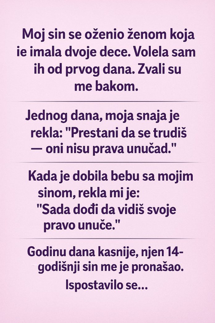 Moj sin se oženio ženom koja je već imala dvoje dece. Od prvog trenutka kada sam upoznala njihovu decu, zavolela sam ih iskreno i duboko, kao da su moja. Zvali su me baka i mojoj je misiji tihog srca bilo da im pružim osećaj pripadnosti i sigurnosti.