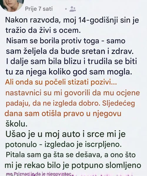 Kada je moj sin, Marko, odlučio da nakon razvoda živi kod svog oca, trudila sam se da poštujem njegov izbor. Verovala sam da će mu promena prijati i da će mu pružiti bliskost koju je dugo želeo. U početku je sve izgledalo savršeno – slali su mi smešne fotografije, video-snimke i poruke pune šale.