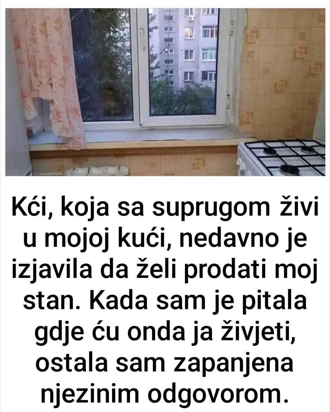 Moja kći je oduvijek pokazivala izraziti egoizam i ravnodušnost prema meni. Svjetlana nikad nije slušala moje savjete, niti je uzimala u obzir moje mišljenje, ali nedavno je njezina drskost i netaktičnost dosegnula vrhunac. Svjetlana je sa suprugom počela živjeti kod mene nakon vjenčanja. Nas troje smo živjeli u trosobnom stanu koji mi je ostavio suprug. Jednog dana, moja kći je pokazala svoju “pamet”: – Mama, – kaže, – mi se s Aleksejom planiramo preseliti u drugi grad zbog posla, i morat ćemo tamo kupiti stan. – Pa, makar u Ameriku, kakve to veze ima sa mnom? – slegnula sam ramenima. – Želimo prodati ovaj stan kako bismo za novac kupili kuću u drugom gradu. Od njenih riječi, oči su mi skoro ispale… kako to prodati?! Nisam namjeravala prodavati ni centimetar svog doma. – A gdje mi onda predlažeš da živim? S vama u drugom gradu, ili što?