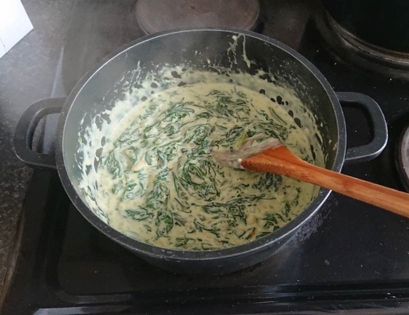 U manjoj šerpi zagrejte ulje ili puter i prodinstajte sitno narendani beli luk. Zatim u smesu ubacite kašiku brašna. Spanać pomiješajte sa mlijekom, razmućenim jajetom i mješavinom bijelog luka i brašna. Smjesu začinite i kuhajte na laganoj vatri dok ne dobije gustu konzistenciju.