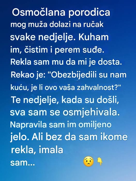 Do podne bi stizala cijela muževa porodica — svih osam članova. Dočekivala sam ih s ljubaznim osmijehom, dok sam u sebi odbrojavala sate do večeri. Oni su jeli, razgovarali i hvalili hranu, a ja sam sjedila tiho, noseći umor koji se godinama gomilao.