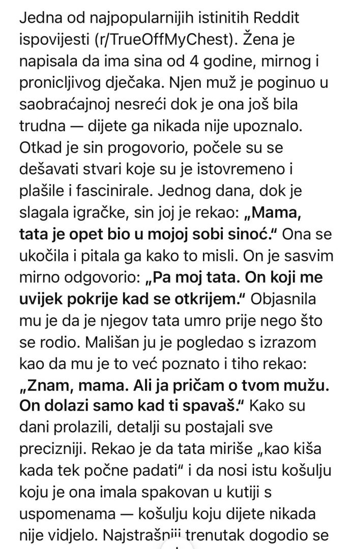 Jedna od najpopularnijih istinitih Reddit ispovijesti (r/TrueOffMyChest). Žena je napisala da ima sina od 4 godine, mirnog i pronicljivog dječaka. Njen muž je poginuo u saobraćajnoj nesreći dok je ona još bila trudna — dijete ga nikada nije upoznalo. Otkad je sin progovorio, počele su se dešavati stvari koje su je istovremeno i plašile i fascinirale. Jednog dana, dok je slagala igračke, sin joj je rekao: „Mama, tata je opet bio u mojoj sobi sinoć.“ Ona se ukočila i pitala ga kako to misli. On je sasvim mirno odgovorio: „Pa moj tata. On koji me uvijek pokrije kad se otkrijem.“ Objasnila mu je da je njegov tata umro prije nego što se rodio. Mališan ju je pogledao s izrazom kao da mu je to već poznato i tiho rekao: „Znam, mama. Ali ja pričam o tvom mužu. On dolazi samo kad ti spavaš.“ Kako su dani prolazili, detalji su postajali sve precizniji.