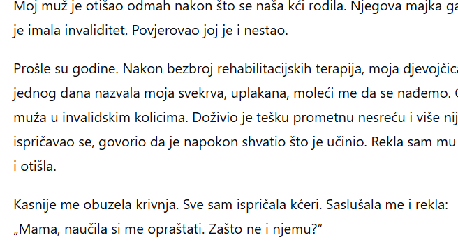 Moj muž je otišao odmah nakon što se naša kći rodila. Njegova majka ga je uvjerila da dijete nije njegovo jer je imala invaliditet. Povjerovao joj je i nestao.Prošle su godine. Nakon bezbroj rehabilitacijskih terapija, moja djevojčica je naučila hodati. A onda me jednog dana nazvala moja svekrva, uplakana, moleći me da se nađemo. Otišla sam i ugledala svog bivšeg muža u invalidskim kolicima. Doživio je tešku prometnu nesreću i više nije mogao hodati. Plakao je, ispričavao se, govorio da je napokon shvatio što je učinio. Rekla sam mu da našoj obitelji ne trebaju izdajnici i otišla.