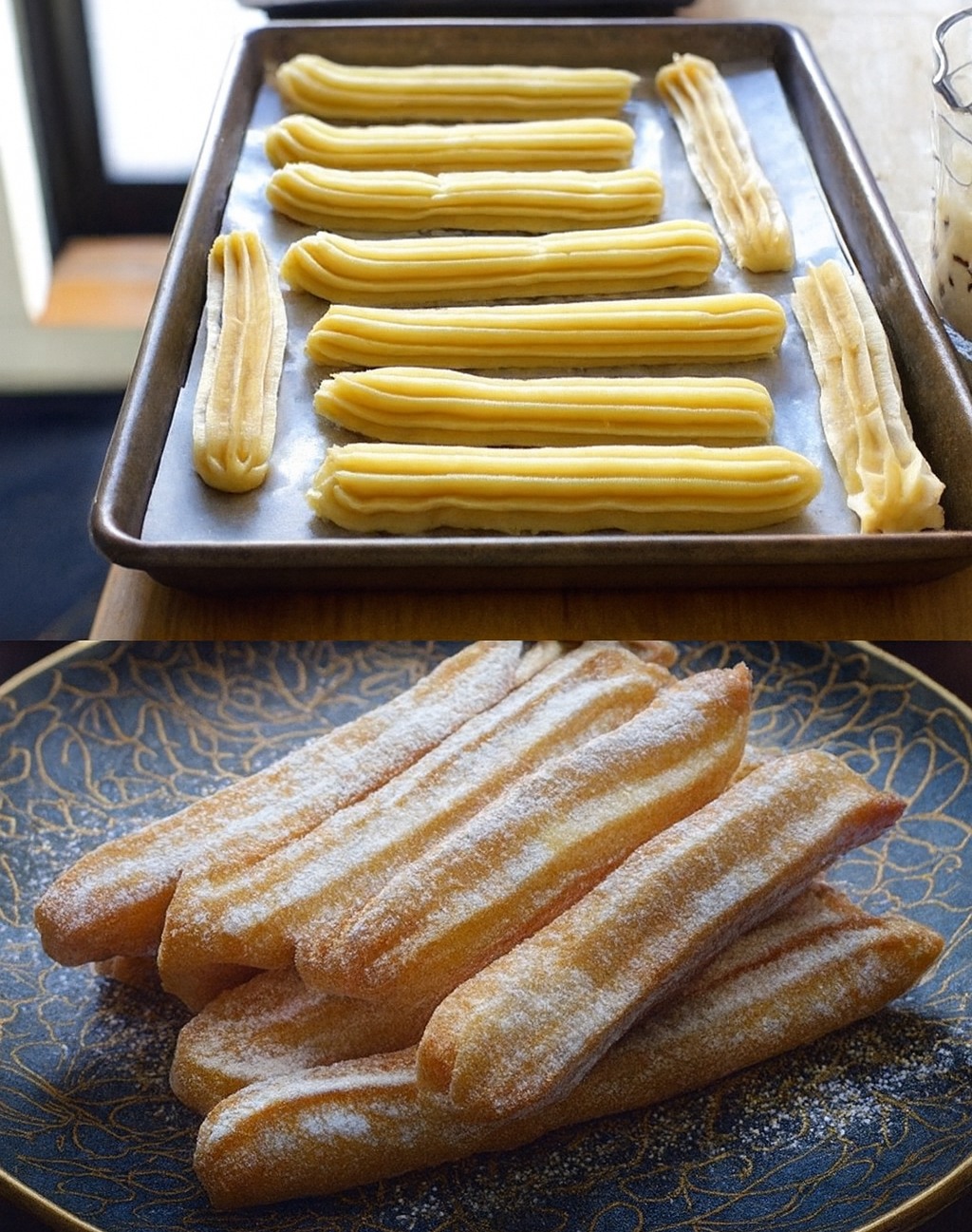 Ove hrskave trakice idealan su desert kada želite nešto brzo i efektno. Mekane iznutra, hrskave spolja i obavezno poslužene uz čokoladni umak – jednostavno nestaju za tren. Osim što se prave od osnovnih sastojaka koje uvijek imate kod kuće, mogu se pržiti ili peći, pa ih svako može pripremiti po svom ukusu. Uživajte u toplim, mirisnim churrosima i podijelite ih s nekim – jer u tome je sva čar ovog recepta! 🍩🤍