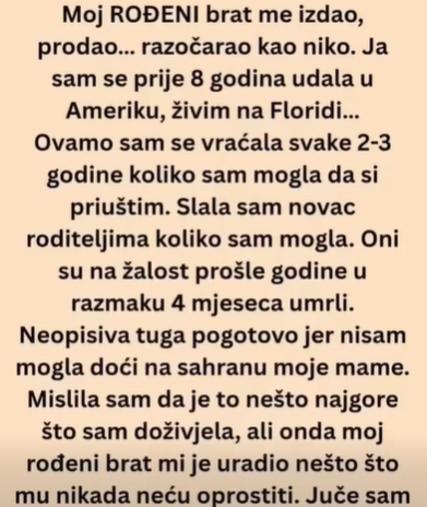 Moj ROĐENI brat me izdao, prodao… razočarao kao niko. Ja sam se prije 8 godina udala u Ameriku, živim na Floridi…