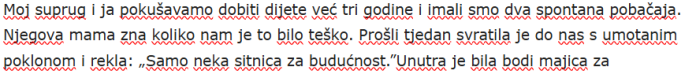Moj suprug i ja pokušavamo dobiti dijete već tri godine i imali smo dva spontana pobačaja. Njegova mama zna koliko nam je to bilo teško. Prošli tjedan svratila je do nas s umotanim poklonom i rekla: „Samo neka sitnica za budućnost.”Unutra je bila bodi majica za novorođenče s natpisom: „Požuri, mama!” Natjerala sam se na osmijeh, ali sam kasnije rekla mužu koliko me to povrijedilo. On je rekao: „Mislila je dobro. Samo je uzbuđena zbog nas.”