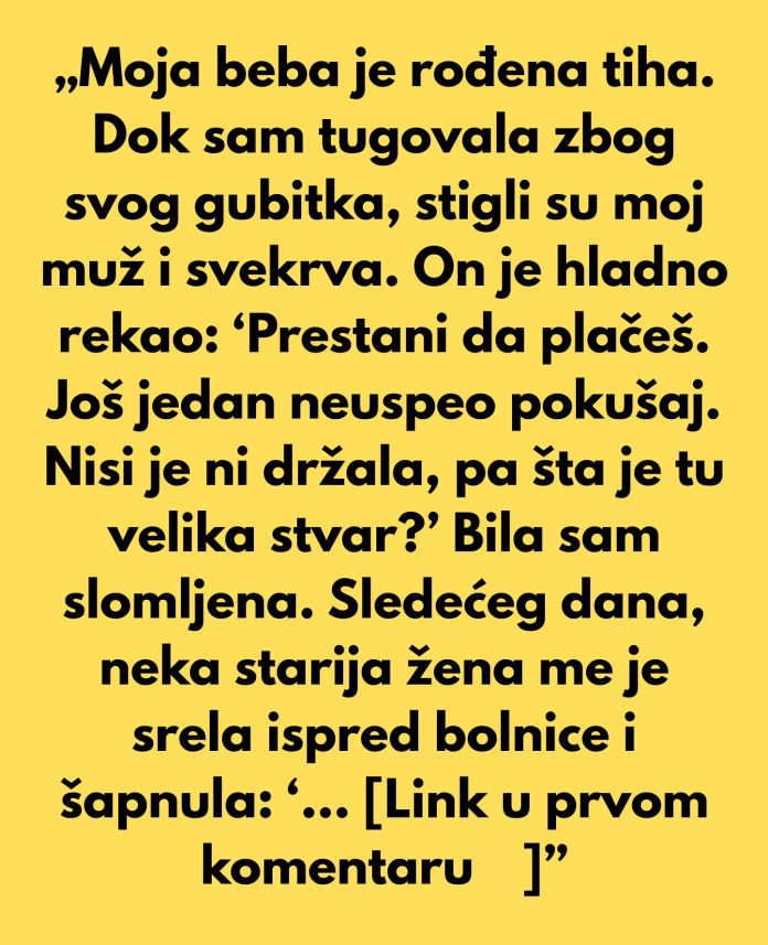 Moja beba je rođena tiha. Mislim da nikada neću zaboraviti tu vrstu tišine. Tugovala sam za svojim gubitkom, još uvek u bolnici, kada su stigli moj muž i svekrva.