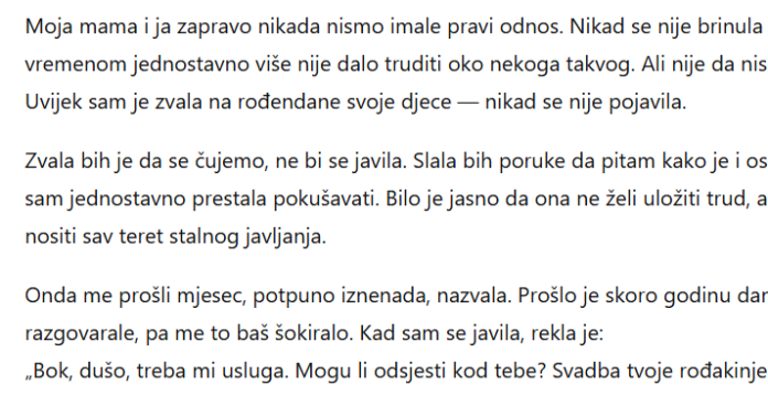 Moja mama i ja zapravo nikada nismo imale pravi odnos. Nikad se nije brinula za mene, a meni se s vremenom jednostavno više nije dalo truditi oko nekoga takvog. Ali nije da nisam pokušavala kroz život. Uvijek sam je zvala na rođendane svoje djece — nikad se nije pojavila.Zvala bih je da se čujemo, ne bi se javila. Slala bih poruke da pitam kako je i ostajala bih na “seen”. Na kraju sam jednostavno prestala pokušavati. Bilo je jasno da ona ne želi uložiti trud, a nisam mislila da bih ja trebala nositi sav teret stalnog javljanja.