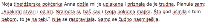 Bila si okrutna prema meni, ali ja okrutnost neću vraćati. Ova odjeća je za tebe. Ne brini za mene. Dobro sam.“