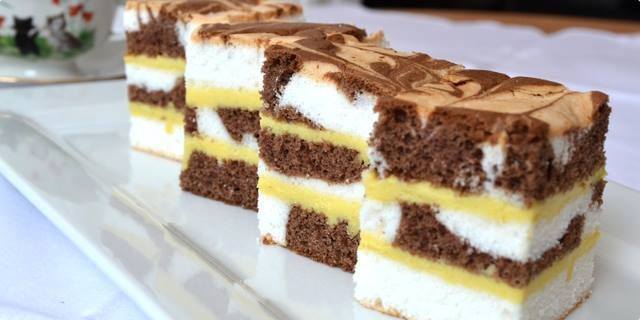 U kalup veličine otprilike 25×35 stavite pek papir. Stavite jednu žlicu bijele smjese pa do nje žlicu crne i tako tok ne popunite pravi red. Drugi red slažite obrnuto, na bijeli biskvit stavite crni a na crni bijelu smjesu.