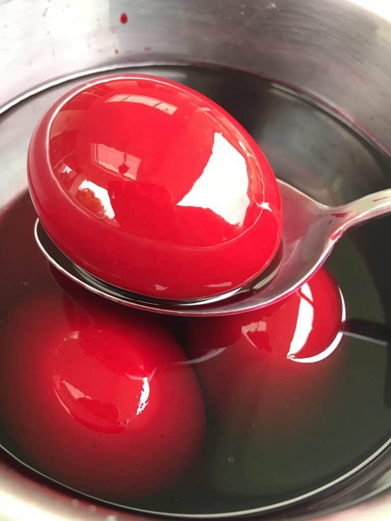 Crvena jaja ne služe samo kao ukrasni element, već i kao snažan amblem vjere i nade. Da bi se postigla prirodna crvena boja, može se koristiti sok iscijeđen iz domaćih trešanja.