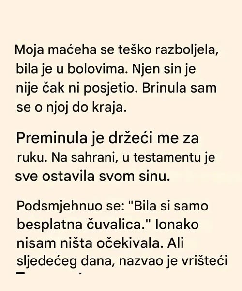 Objasnila je da nije mogla da mijenja testament bez rizika da izazove dodatne porodične probleme, ali je željela da znam da joj je ono što sam joj dao — pažnja, razumevanje i tišina bez osude — značilo više od bilo čega materijalnog.
