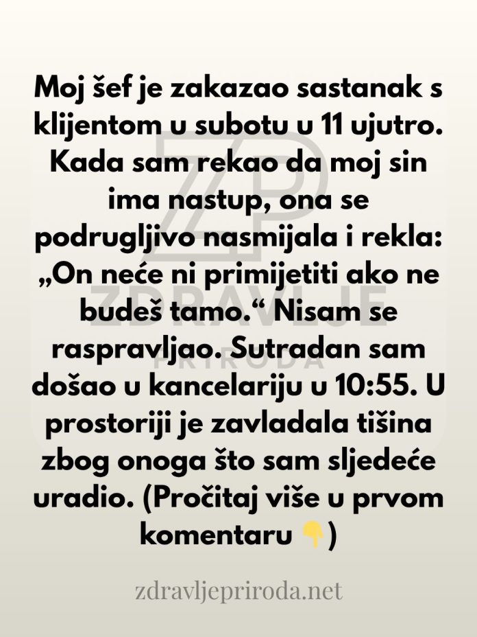Moj menadžer je stavio obavezan sastanak u kalendar za subotu u 11 ujutro. Kada sam spomenula da moj sin ima nastup, odgovorila je: „On neće ni primijetiti ako ne budeš tamo. Zaboraviće da uopšte postojiš.“