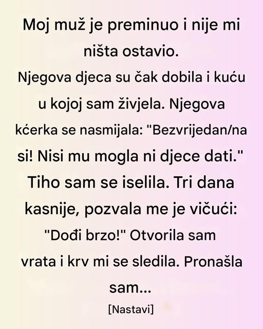 Njegova ćerka je ubrzo došla u kuću i jasno pokazala da smatra da ja tu više nemam mesto. Njene reči i ponašanje ostavili su dubok osećaj povređenosti i razočaranja. Posebno me je zabolelo jer mi je moj muž tokom života često govorio da je taj dom moj i da ću u njemu moći da živim do kraja života. Verovala sam mu bez sumnje.