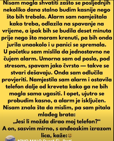 U početku sam mislila da jednostavno ne čujem alarm. Umorna sam od posla, pod stresom, spavam jako čvrsto — takve se stvari dešavaju. Onda sam odlučila provjeriti. Namjestila sam alarm i ostavila telefon dalje od kreveta kako ga ne bih mogla sama ugasiti. I opet, ujutro se probudim kasno, a alarm je isključen.