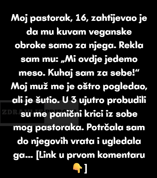 Moj pastorak, Dylan, 16, zahtijevao je da mu kuvam veganske obroke samo za njega. Rekla sam mu: „U ovoj kući jedemo meso. Ako želiš vegansko, kuhaj sam!“ Moj muž me je oštro pogledao, ali je šutio.