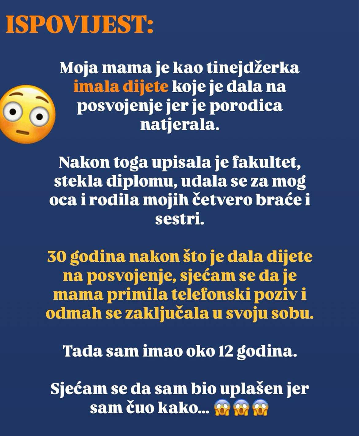— Moja mama je kao tinejdžerka imala dijete koje je dala na posvojenje. Nakon toga upisala je fakultet, stekla diplomu, udala se za mog oca i rodila mojih četvero braće i sestri. 30 godina nakon što je dala dijete na posvojenje, sjećam se da je mama primila telefonski poziv i odmah se zaključala u svoju sobu. Tada sam imao oko 12 godina. Sjećam se da sam bio uplašen jer sam čuo kako moja mama plače, ali nije htjela nikome reći zašto plače ili s kim je razgovarala.