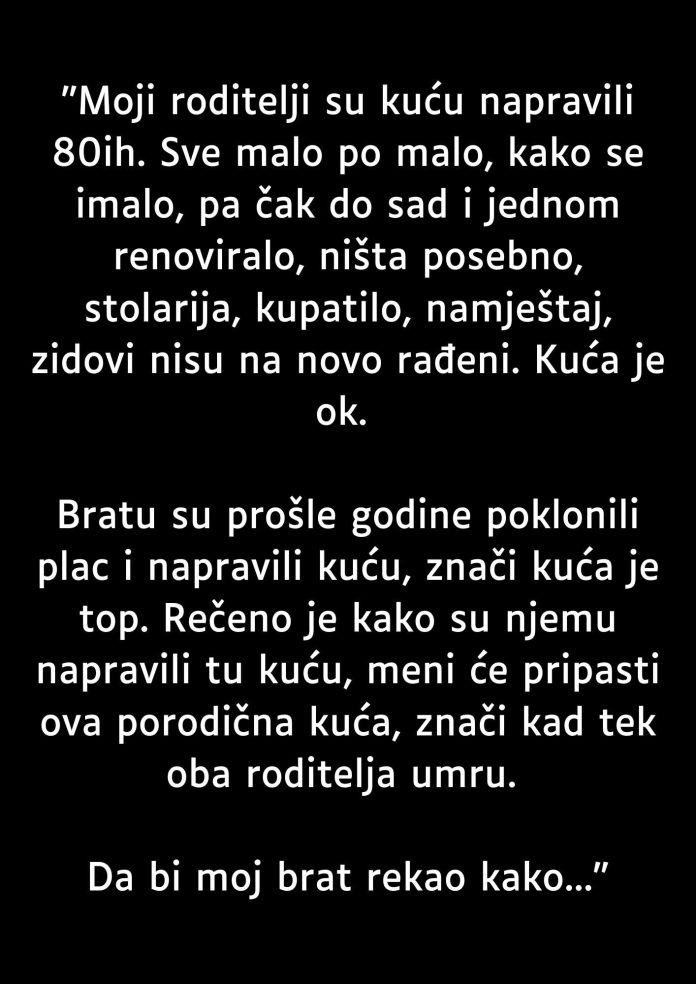 Bratu su prošle godine poklonili plac i napravili kuću, znači kuća je top. Rečeno je kako su njemu napravili tu kuću, meni će pripasti ova porodična kuća, znači kad tek oba roditelja umru.